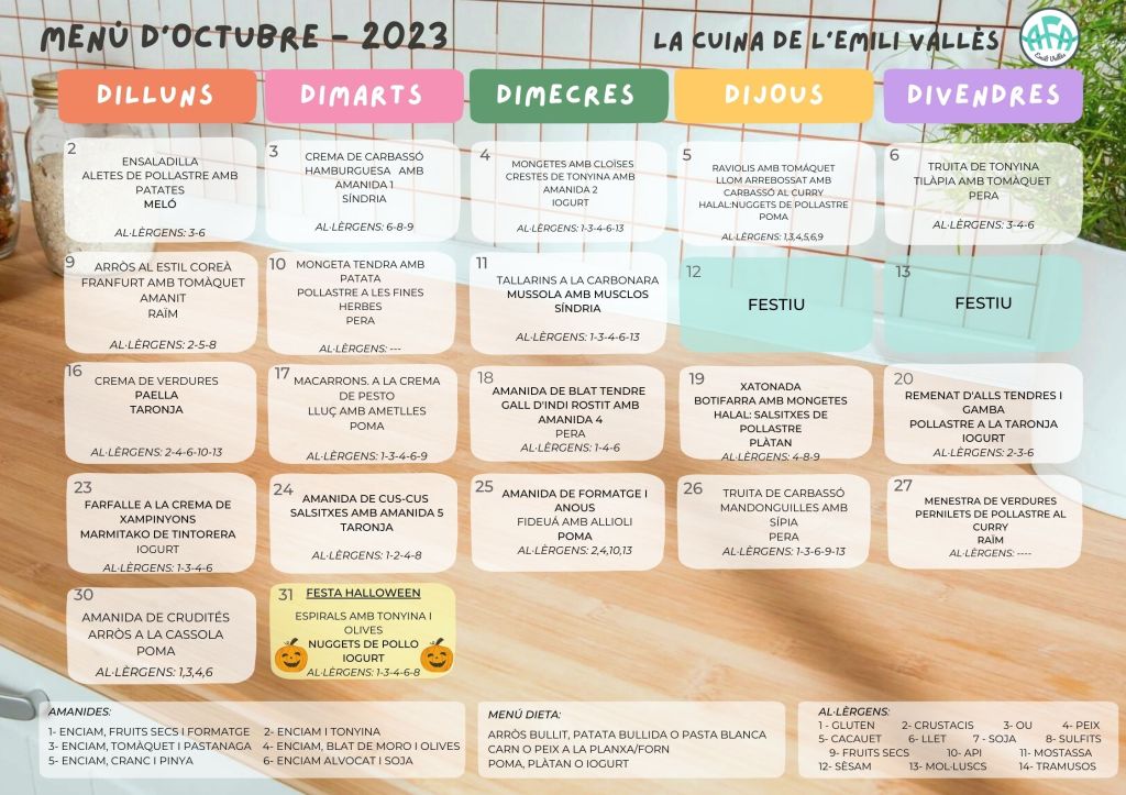 Menú menjador OCTUBRE 2023 Setembre 26, 2023aquest mescomunicacioev Ja us podem avançar el menú del pròxim mes de OCTUBRE. Recordeu 12 i 13 FESTIUS… i la festa mes terrorífica el dia 31!!!! Relacionats