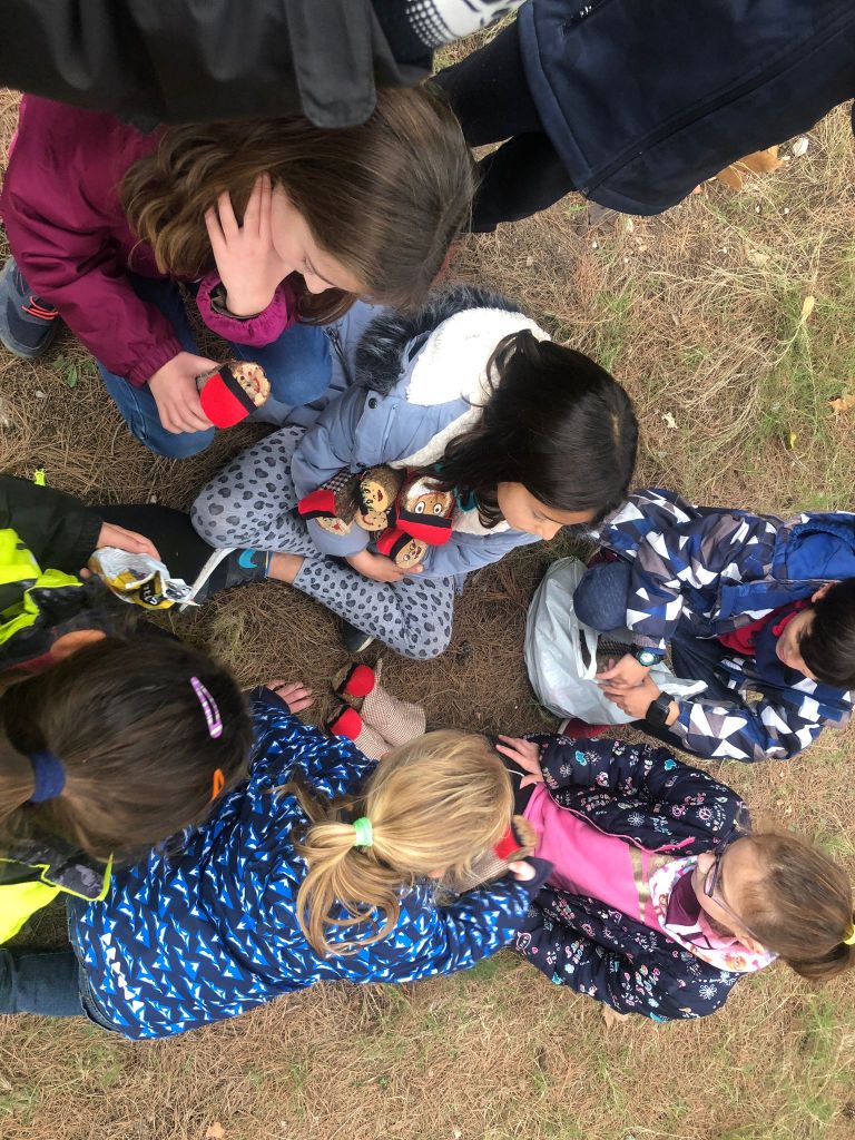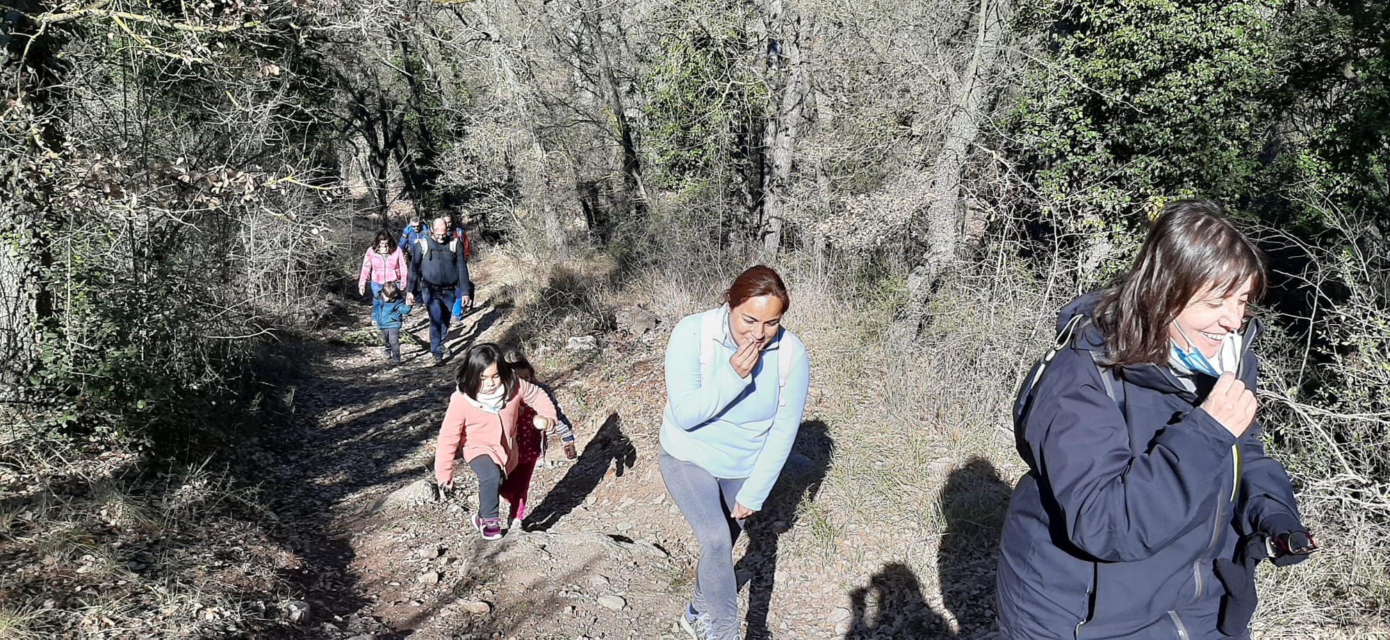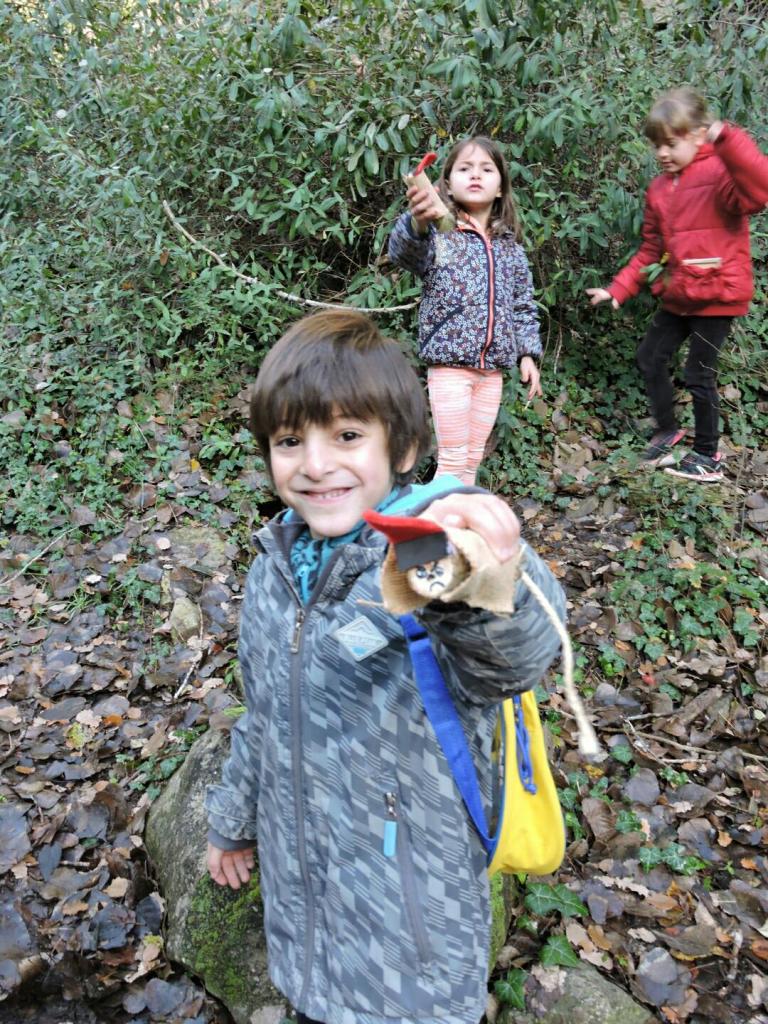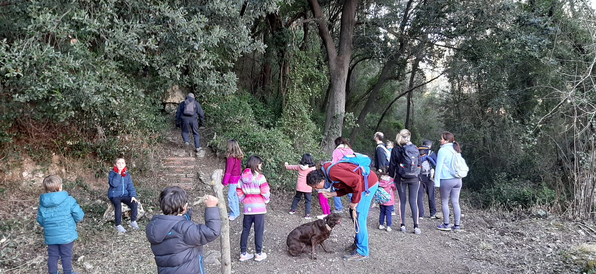 Per una pista molt accessible i després de remuntar per un corriol enmig del bosc, les diferents «pistes» i tresors que, ves per on, la màgia d’aquesta sortida s’havia encarregat de deixar, ens conduïren a una zona més clara del bosc on començava ja a fer olor de tions. I tal dit, tal fet. Els més petits van haver de ser defensats de l’escomesa dels més grans en una mena de cursa per «caçar» tions.