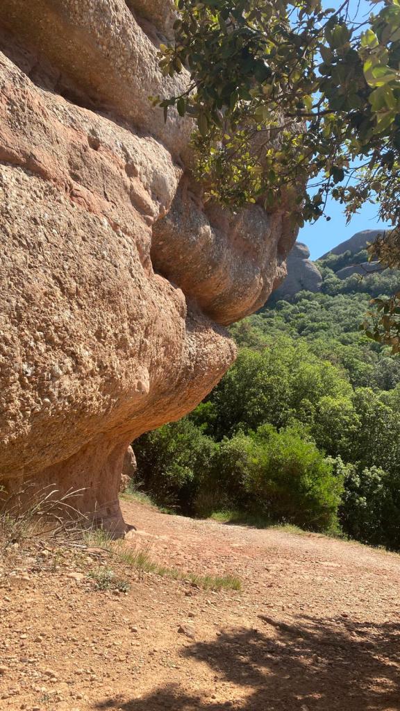 Després d’esmorzar amb la remor de l’aigua i d’una colla d’amics que passegen els gossos, el sender s’encaixona entre les roques per sota una petita balma i s’enfila per un pedregar costerut per travessar per damunt un pont la via del tren de la Renfe de la línia Manresa-Calaf-Lleida. Així s’arriba al punt més alt del nostre recorregut, amb magnífiques vistes de Montserrat i d’imponents masies modernistes com la casa de la Morera.