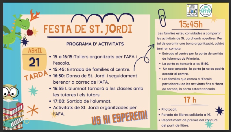 A més d’altres sorpreses!!! No us perdeu aquesta gran tarda!!! Animeu-vos a venir hi ha gaudir d’una tarda de St. Jordi diferent!!!